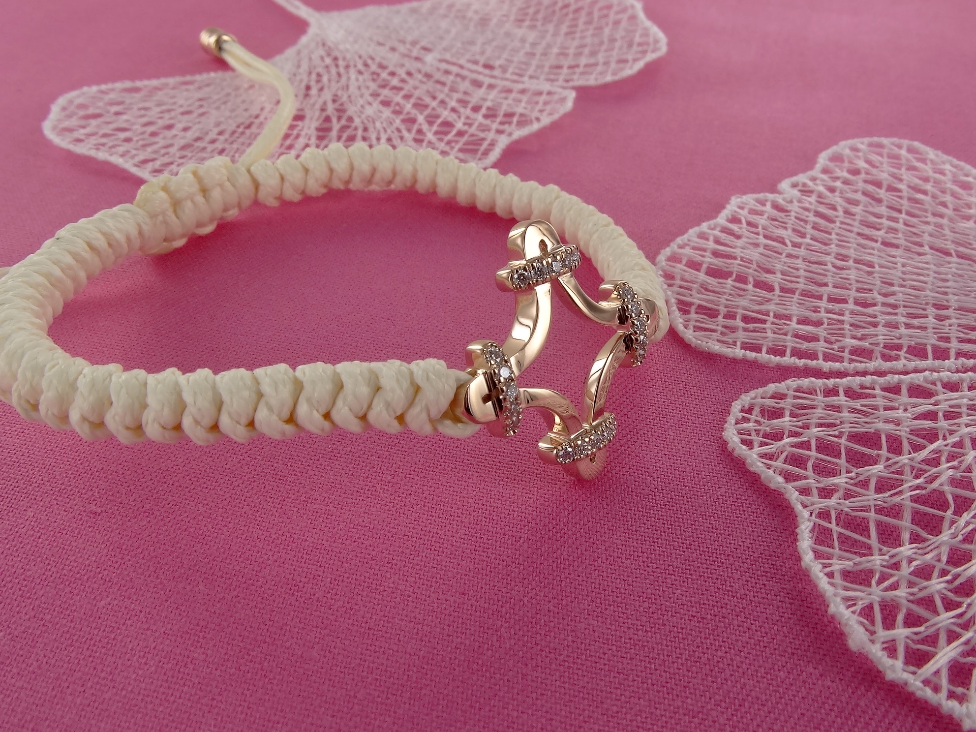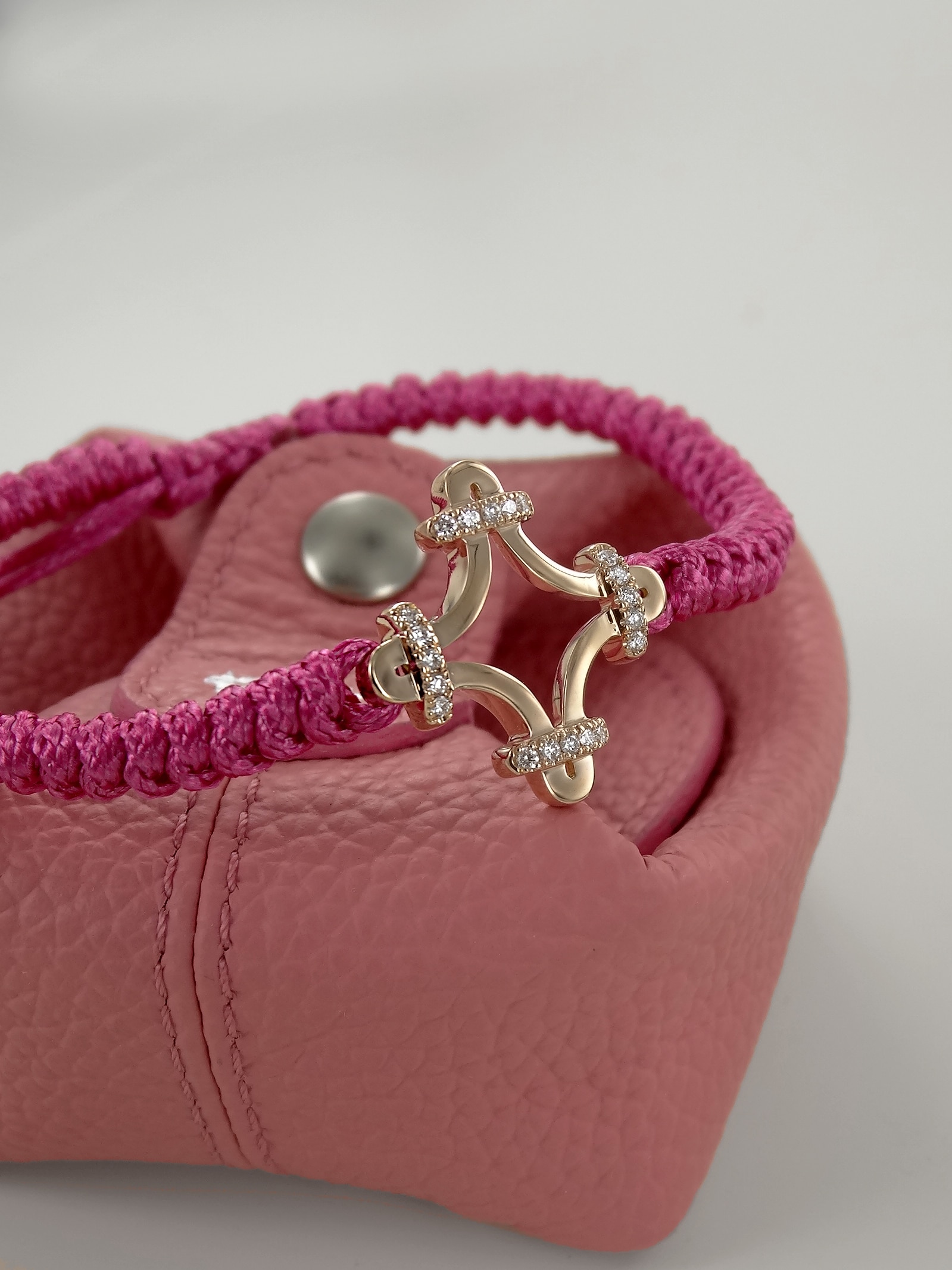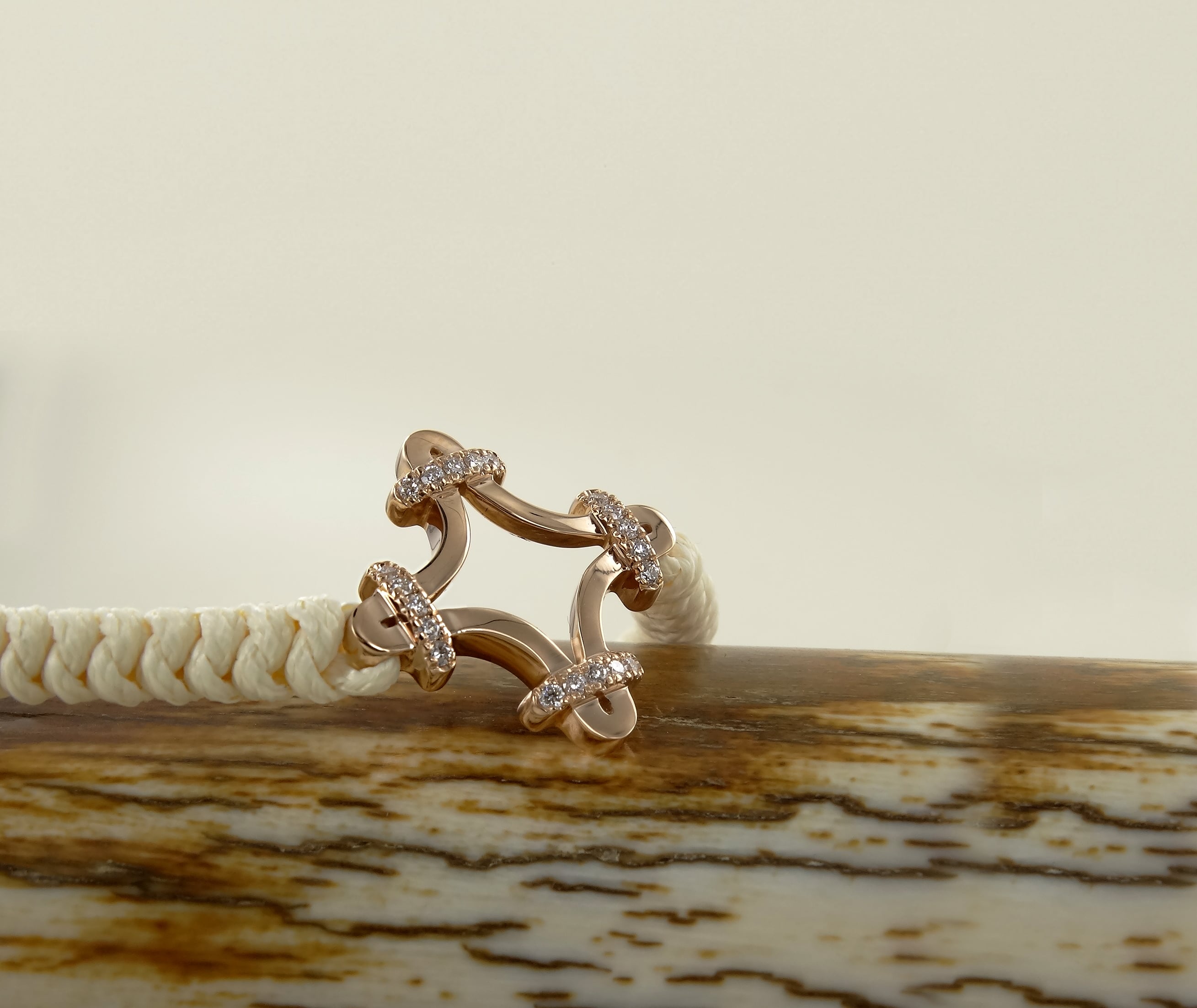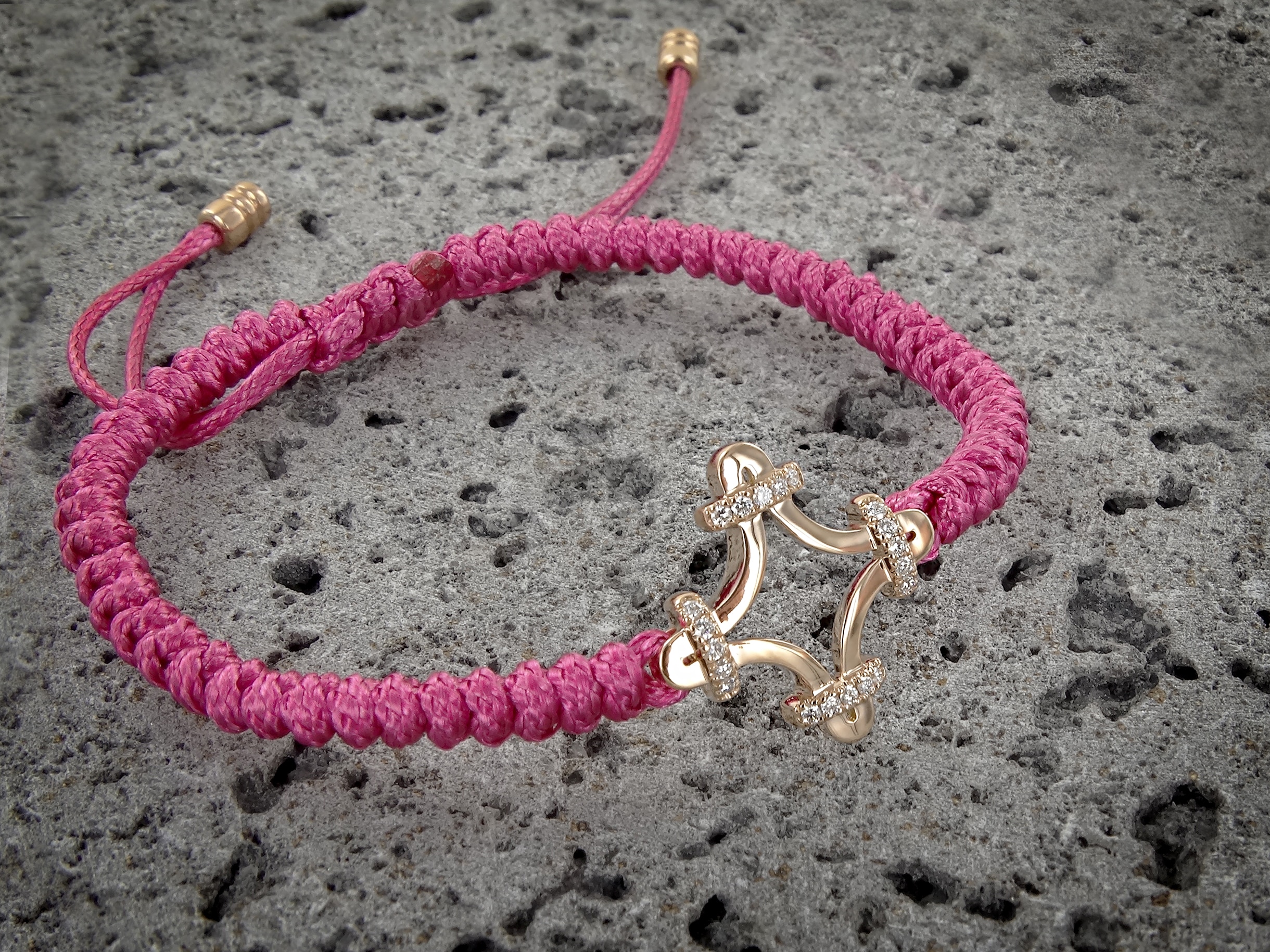 Handcrafted in rose gold and set with 20 diamonds, the Geneva Cross is mounted on a marine cord bracelet braided in our workshops in Carouge. The cord ends are adorned with two charms.