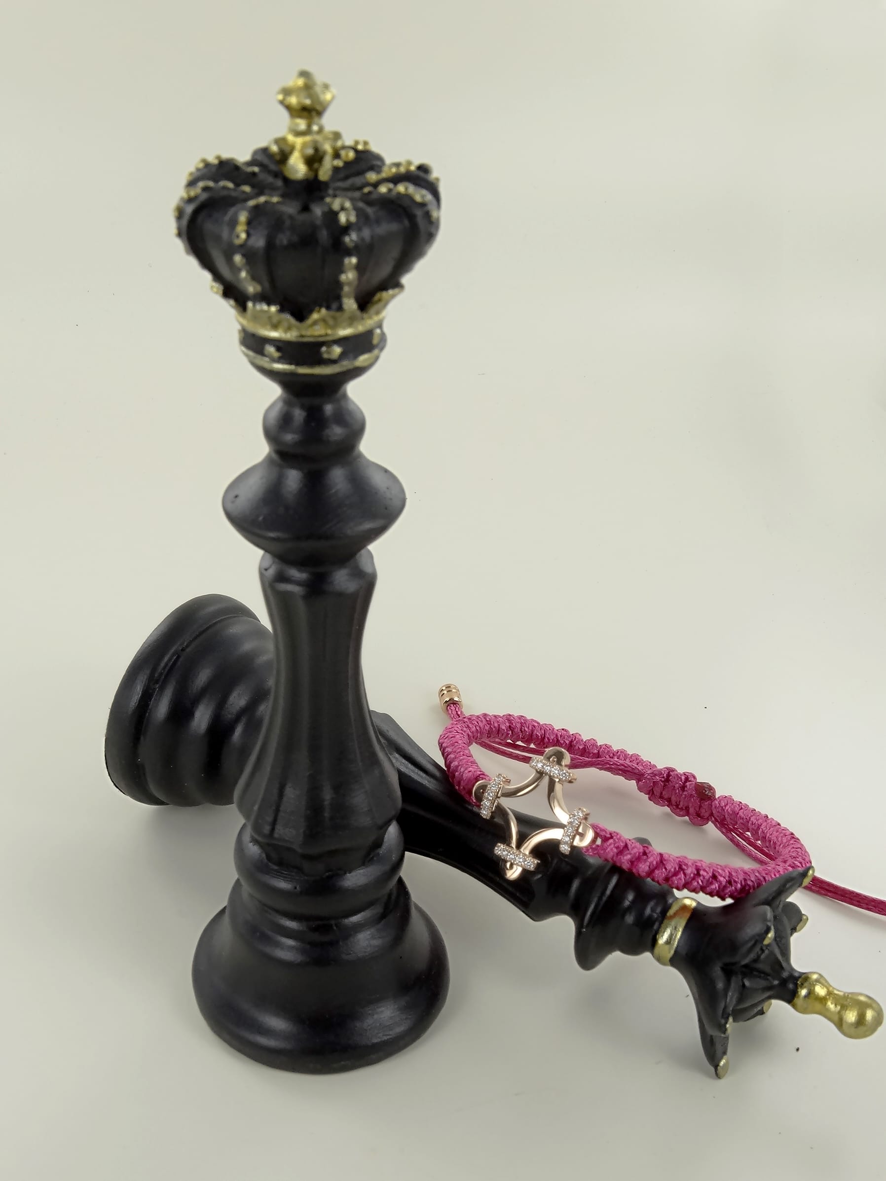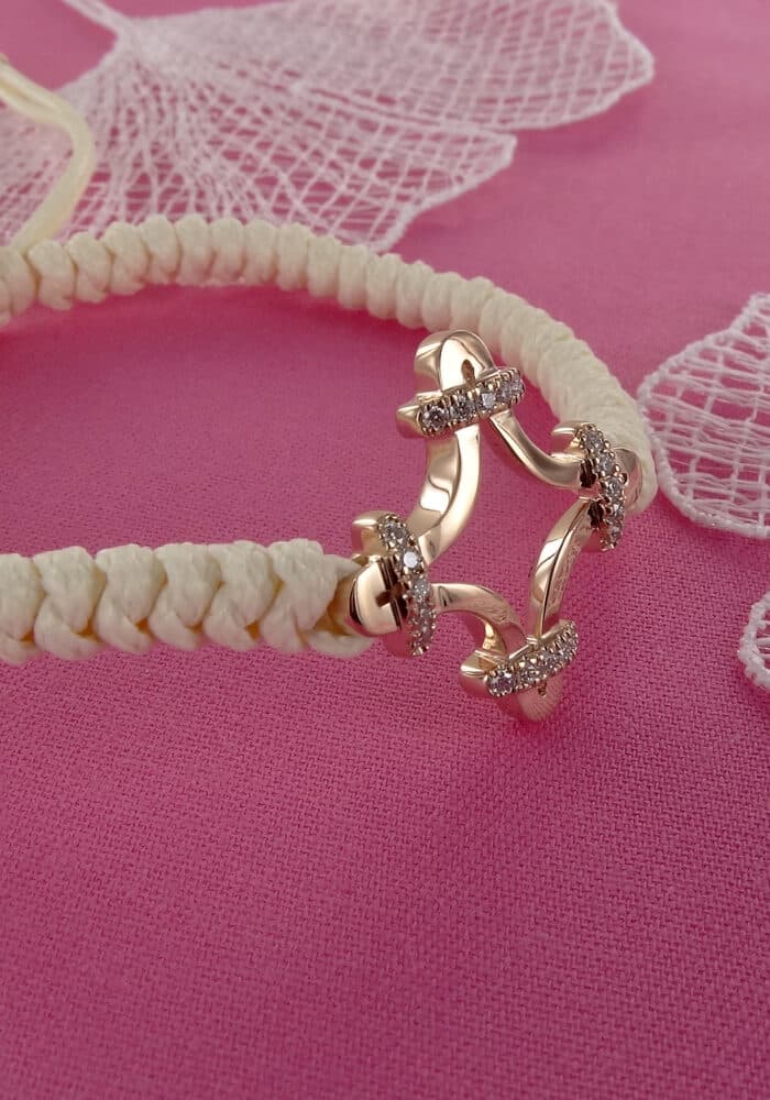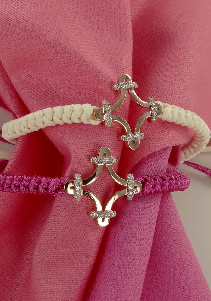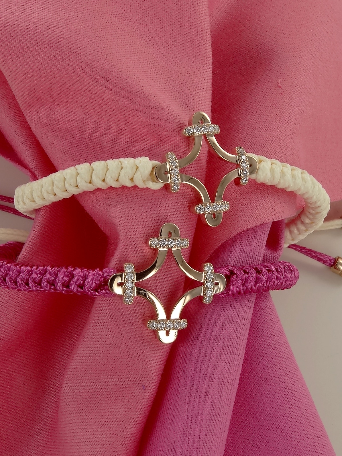 Handcrafted in rose gold and set with 20 diamonds, the Geneva Cross is mounted on a marine cord bracelet braided in our workshops in Carouge. The cord ends are adorned with two charms.