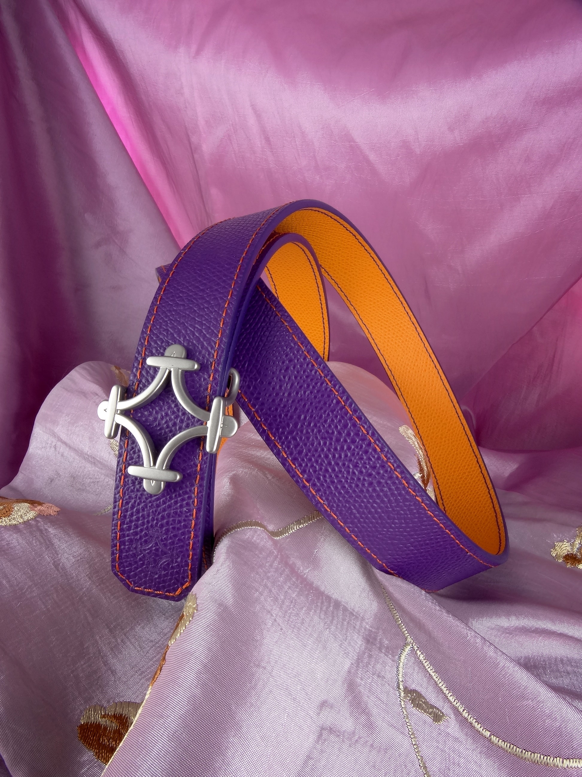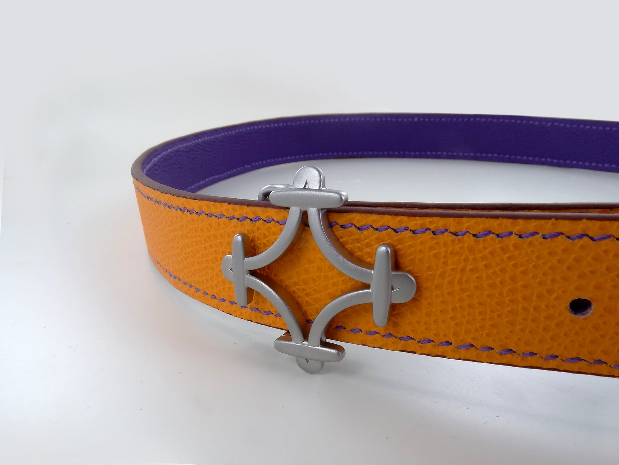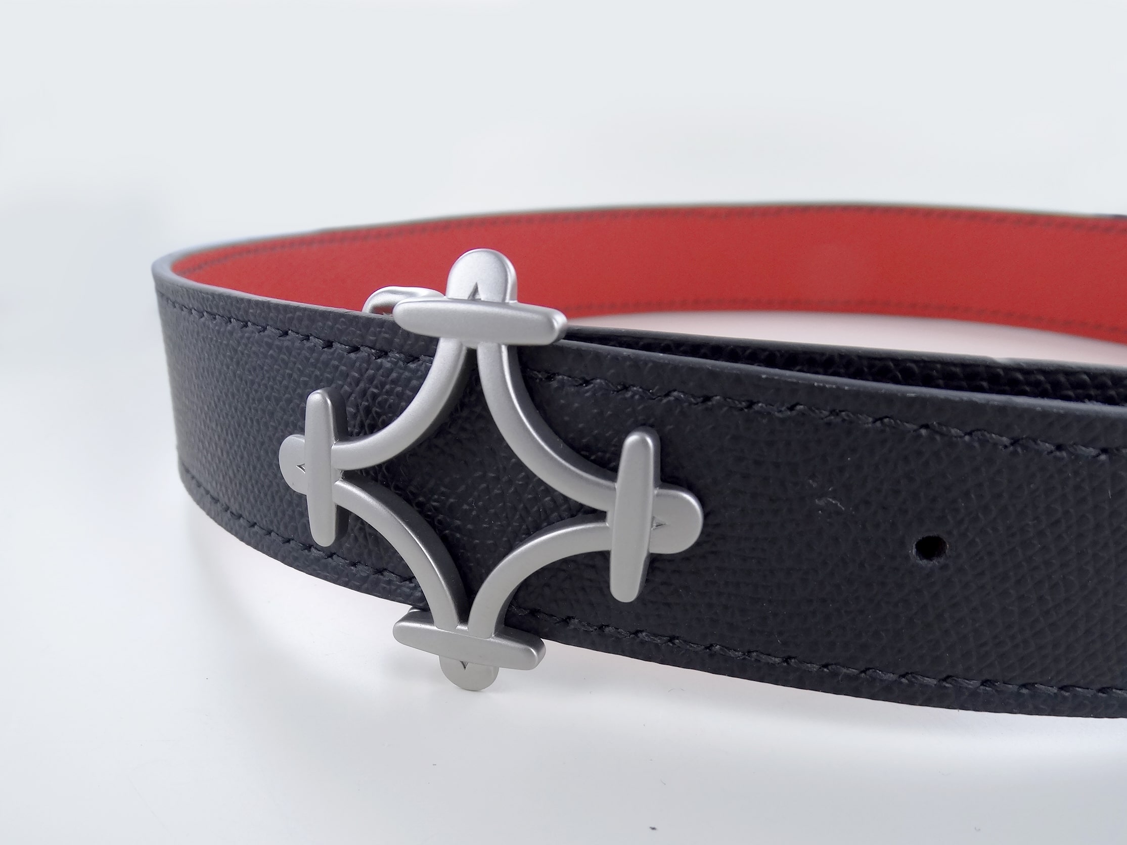 Le concept de cuir réversible adapté à notre boucle, offre le choix de deux couleurs pour une même ceinture.