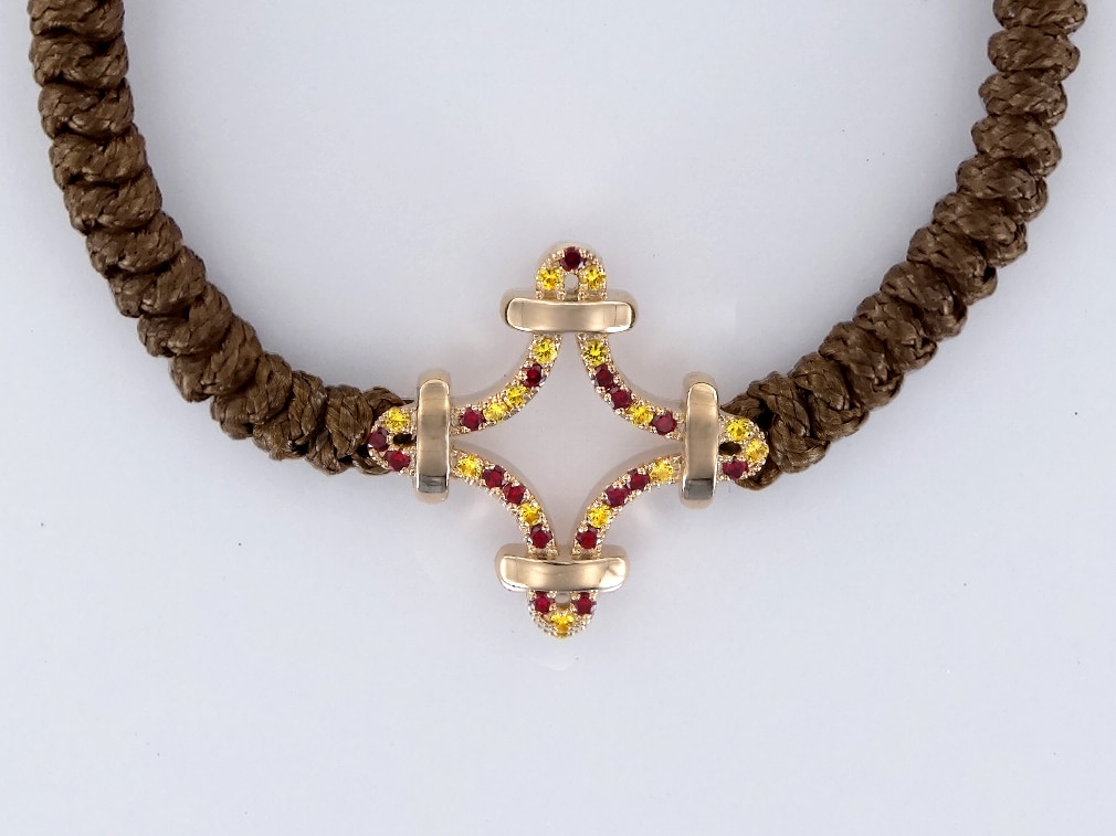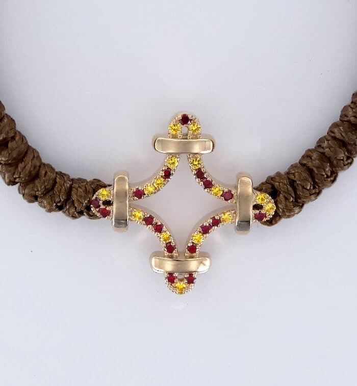 Les extrémités du cordon sont rehaussées de deux pampilles. Extrêmement résistant, le bracelet peut être porté en toutes situations, il supporte la douche, la baignade et même le sauna.